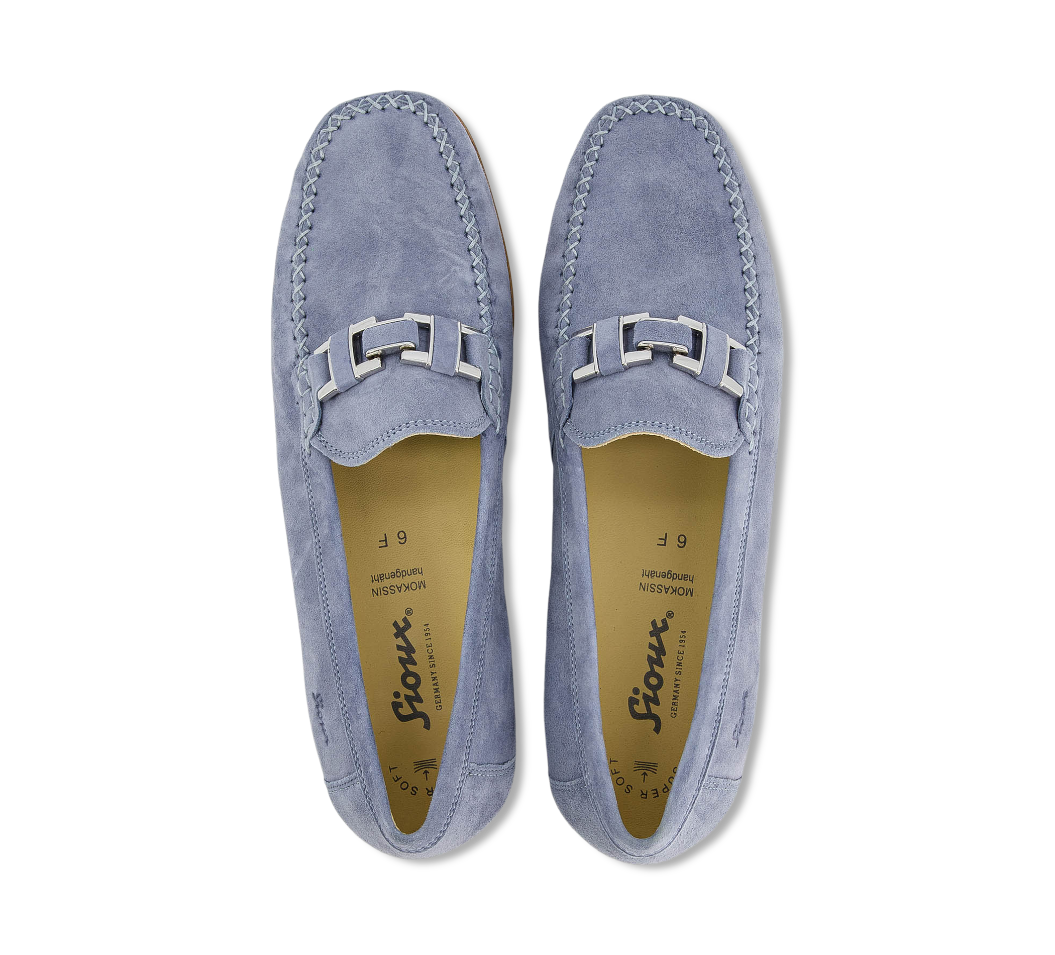 Flacher Damenslipper in Mokassin-Machart in F-Weite aus feinem Ziegenvelours-Leder gefertigt. Beste Passform, zeitlose Eleganz und als Blickfang eine Garnitur in Metall-/Lederkombination. Innen ausgestattet mit Lederfutter und weich gepolsterter, durchgehender Leder-Decksohle. Flexible, feine Gummisohle mit flachem Absatz. Ein typischer Damen-Mokassin von Sioux.