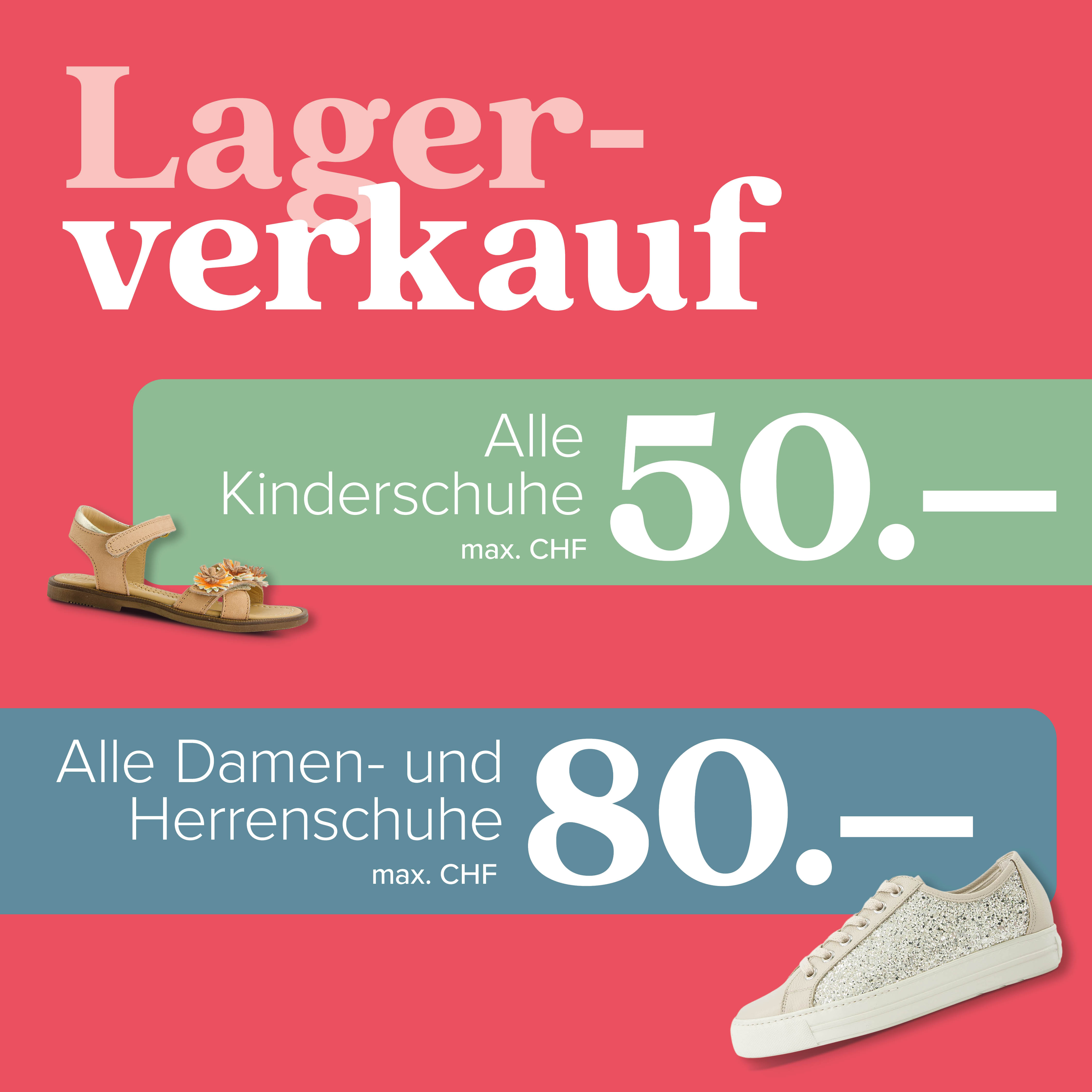 Wir freuen uns, Sie Mitte April zu unserem Lagerverkauf am Hauptsitz unseres Familienunternehmens in Brüttisellen einzuladen. Es erwartet Sie ein vielseitiges Angebot an Frühlings- und Sommerschuhen für die ganze Familie. Und das zu noch sensationelleren Tiefstpreisen: Kinderschuhe gibt es für max. CHF 50.–, Damen- und Herrenschuhe für max. CHF 80.–!