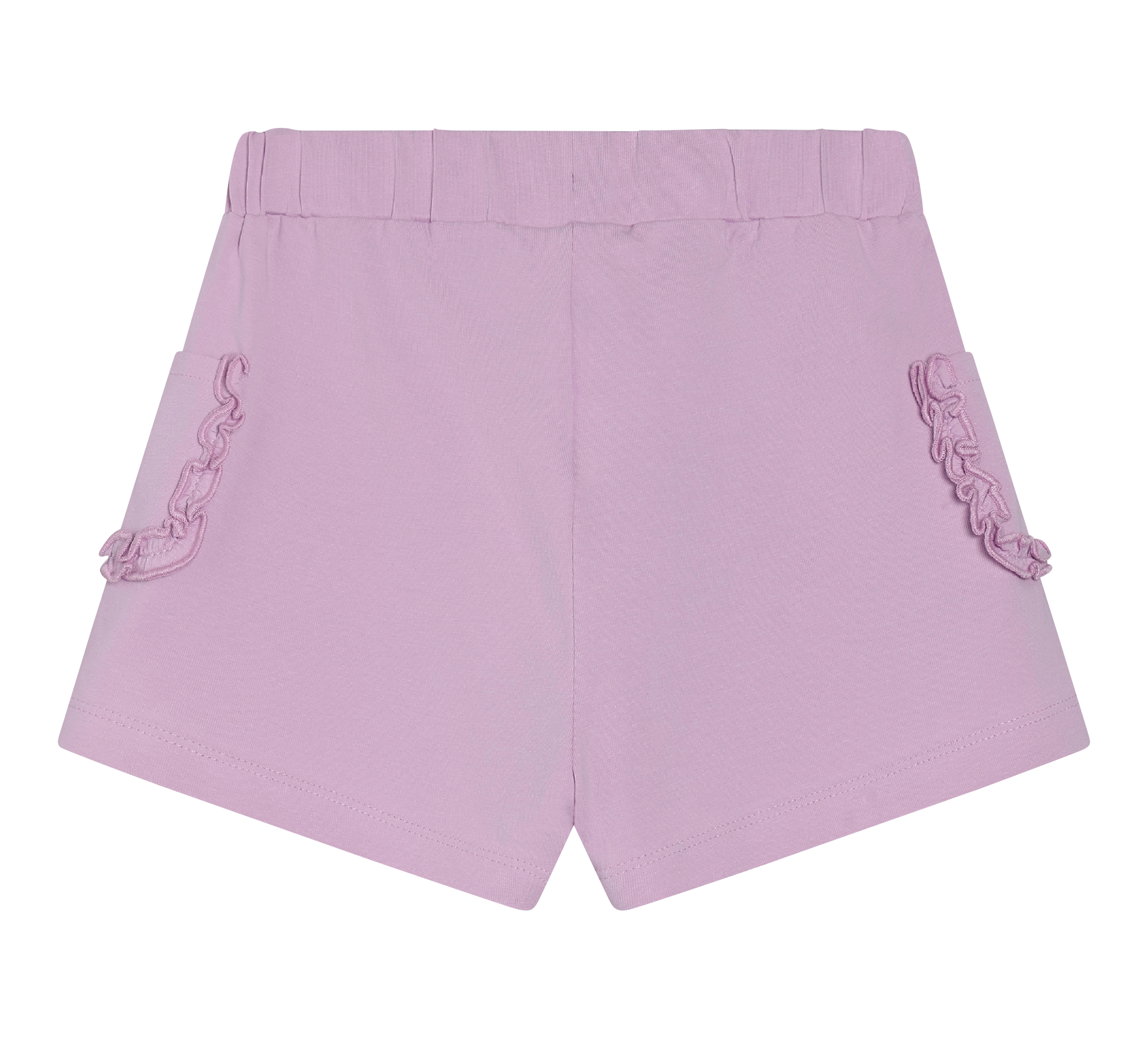 Diese Shorts sind einfarbig. Sie haben auf jeder Seite eine Tasche mit Rüschendetails am Rand. Hergestellt aus zertifizierter Bio-Baumwolle. Zertifiziert nach GOTS – Bio CERES-0366, zertifiziert nach OEKO-TEX® STANDARD 100, Zert.-Nr. 2276-364 DTI.