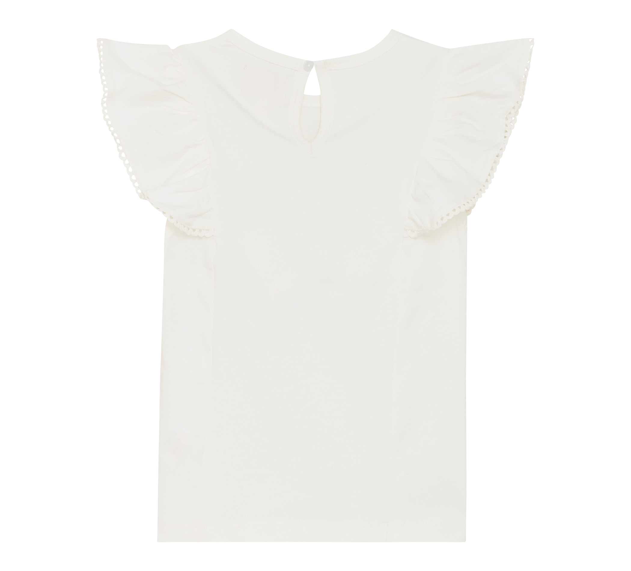 Einfarbiges Single-Jersey-Oberteil von Creamie. Dieses Oberteil hat einen Rüschenstoff am Brustbereich, der bis über die Schultern reicht. Der Rüschenstoff ist aus einem gewebten Material gefertigt und mit Stickereien am Rand verziert.
